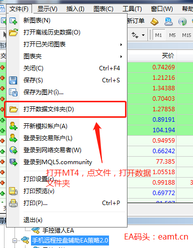 一、在MT4上方菜单栏:文件-打开数据文件,如下图: