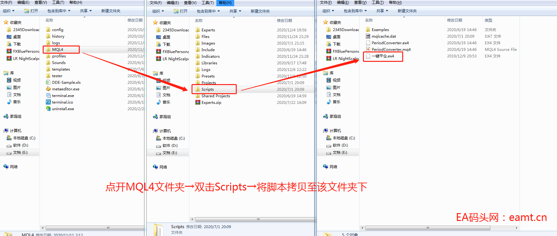 - mq4或ex4后缀的EA文件复制粘贴到MQL4目录下的Experts文件夹中;
