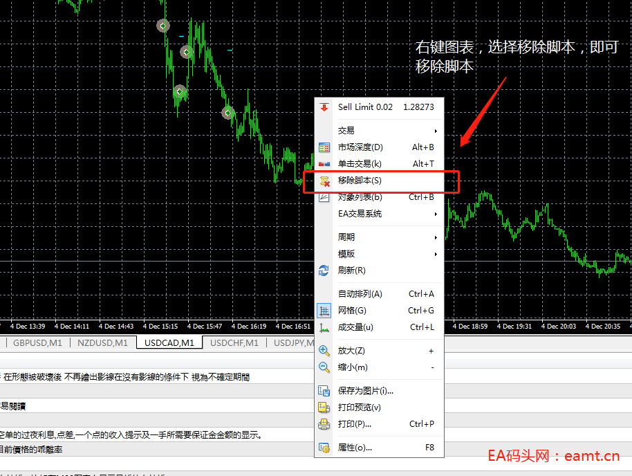 六、一般情况下脚本加载到图表就会执行并且执行完毕会自动退出,如果有时候出现脚本没有执行或退出的话,要清除脚本可以在图表空白处-右键-移除脚本,如果看不到“移除脚本”则说明脚本已经自行退出了。如下图:
