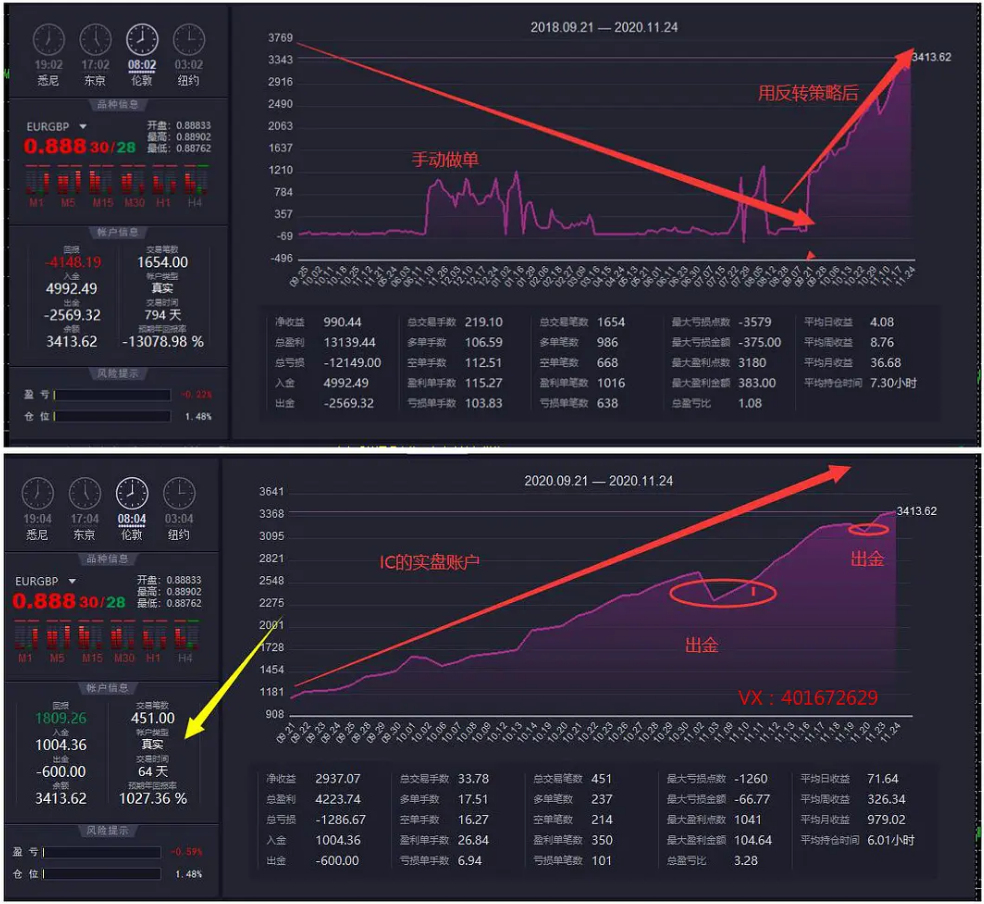 最近一直在专研一款策略,想着能给喜欢交易的汇友,带来一款真正可以盈利并且相对比较稳定的策略,这款策略是经过长时间测试并优化改进的策略! 极限反转-EA: 是一款开单条件严格做单准确率比较高的策略,大小资金都可以跑,策略带止损止盈,5*24小时交易,不需人工干预,100也可回测的策略。 IC实盘账户手动做单和用策略后盈利对比统计图: