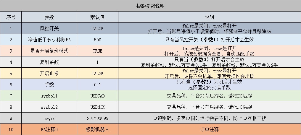 根据其原理,应该使用关联性比较高的货币对,比如EURUSD和GBPUSD,该EA也常用于USDCAD和USDNOK(这个品种比较罕见)。