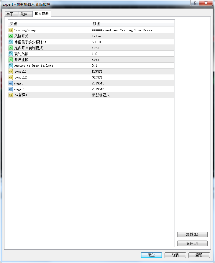 - 在欧美1分钟图,加载EA,按照图设置参数