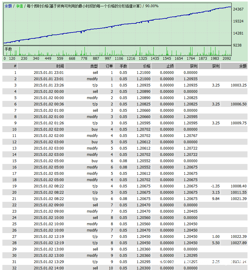 这是一个马丁型的EA,在2015年1月1日至今的回测里,这个EA是相当赚钱的,图中回测使用的参数初始手数为0.05,时间周期为30分,有加仓,最大加仓到1.07,整个回测中加仓的单子绝对算少数。 |