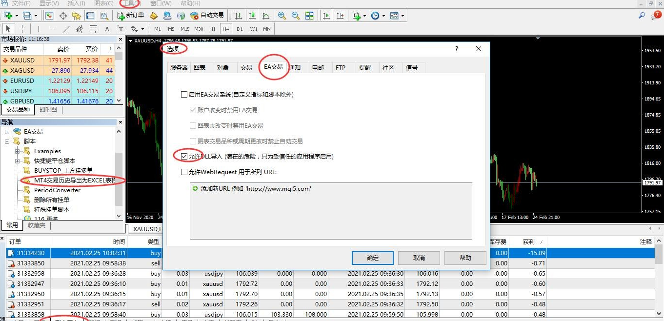 由于脚本的一些功能需要调用动态链接库,所以在使用脚本前,还需要在上方菜单栏点“工具/选项/EA交易”并勾选允许DLL导入,如下图所示: