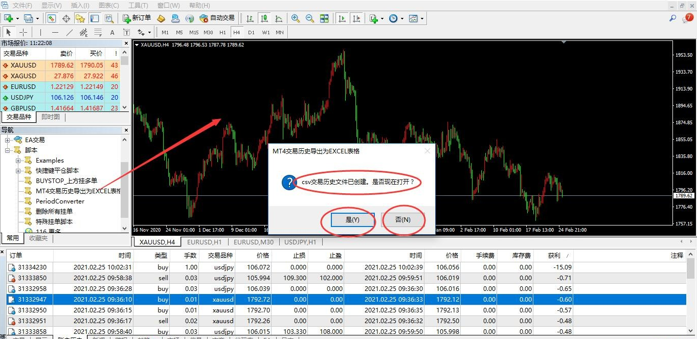 脚本无需设置参数,使用前先在账户历史里面鼠标右键,选择需要导出的历史记录时间段,如本月、最近三个月、或者其它自定义时间段。选择好时间段以后,鼠标拖拽脚本到图表并直接点确定即可。脚本执行完毕,会弹出一个对话框,询问是否打开文件。可以点“是”尝试一下能否直接打开,如下图所示