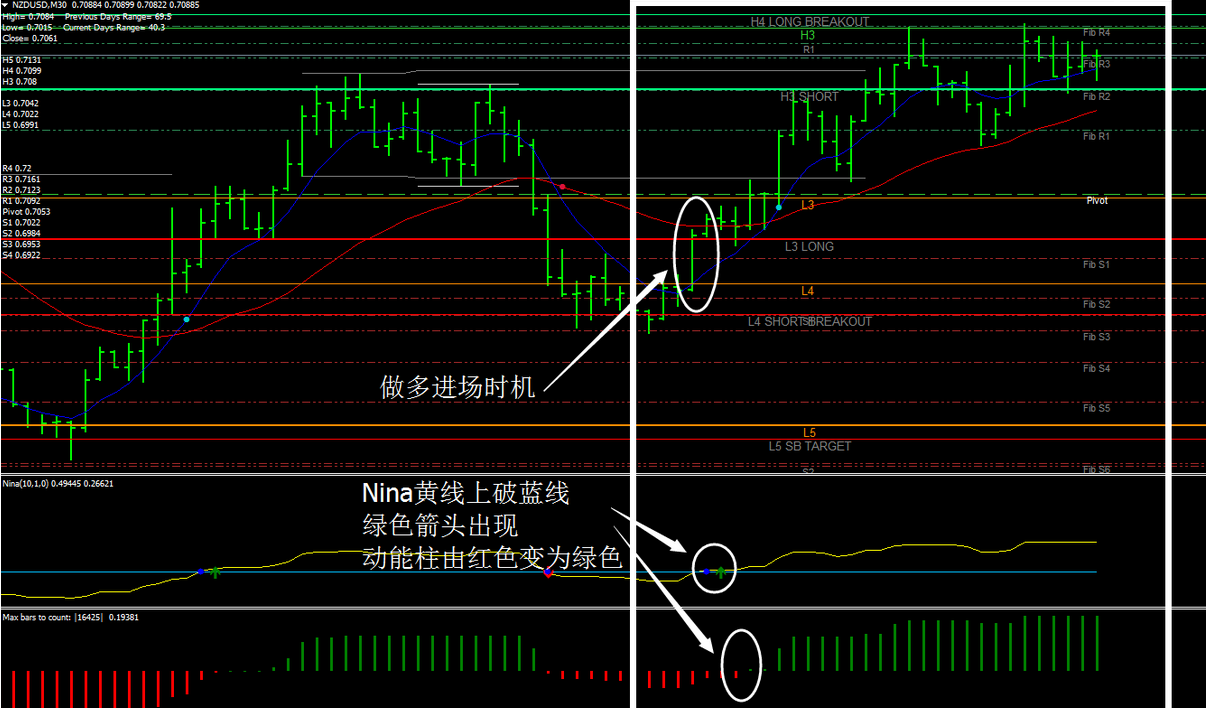 1.做多时机:当价格上破两条移动平均线(EMA50,EMA120),Nina指标黄线上破蓝线并出现绿色箭头,Max bars to counts指标红色动能柱转为绿色。