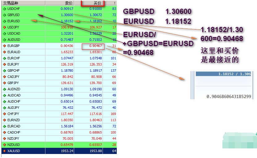 举列如下图:交叉货币EURGBP欧磅数值的计算和由来