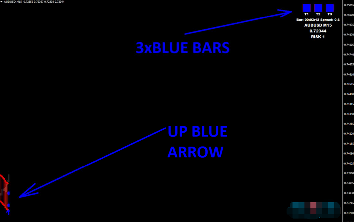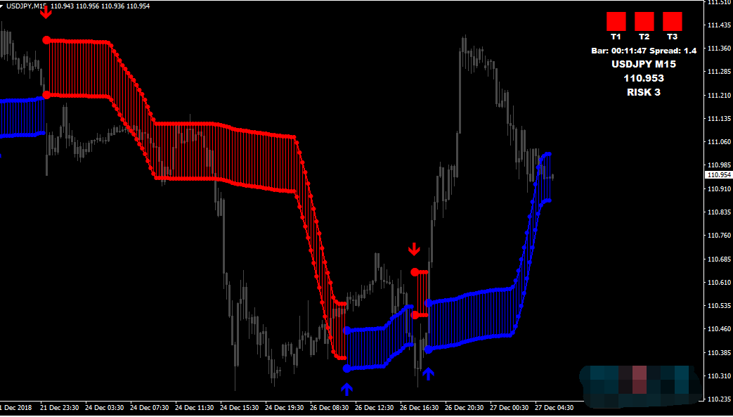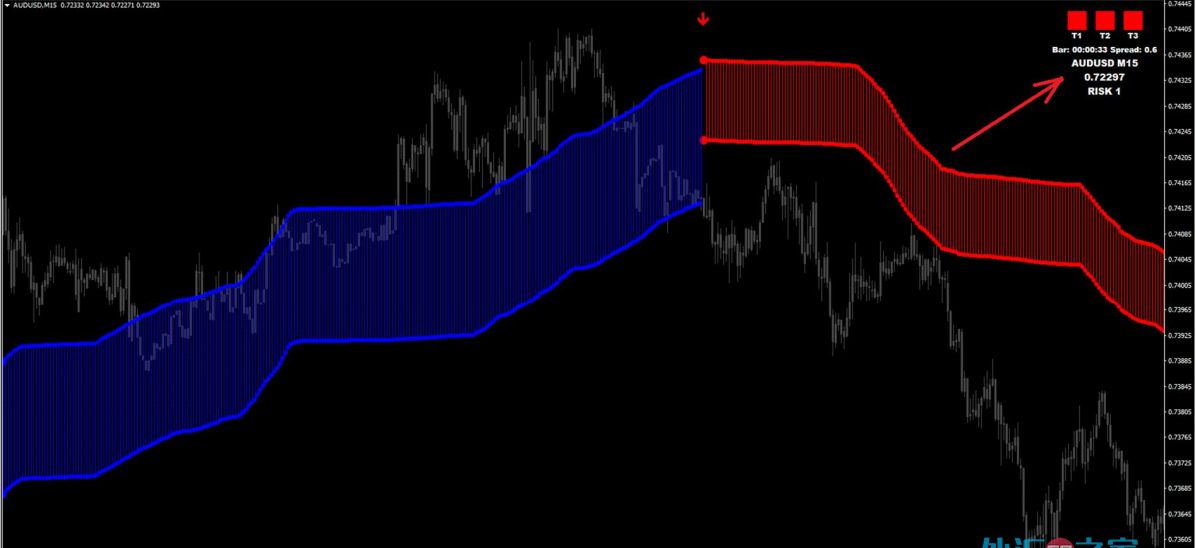 这个交易系统由两部分组成。![]() 第一个是进场,由红色和蓝色带子构成。 第二个部分是,右上角的趋势面板。 ![]() 进场例子: 右上角的趋势面板为3个蓝色柱子。 主图中为向上的蓝色箭头。 ![]() 具体说明:当蓝色箭头出现后,会有一个报警提示,我们接着检查右上角的趋势面板,最好的做多条件是出现3个蓝色的柱子,这样的精准度更高一些。当出现红色箭头后,就可以出场了。 |