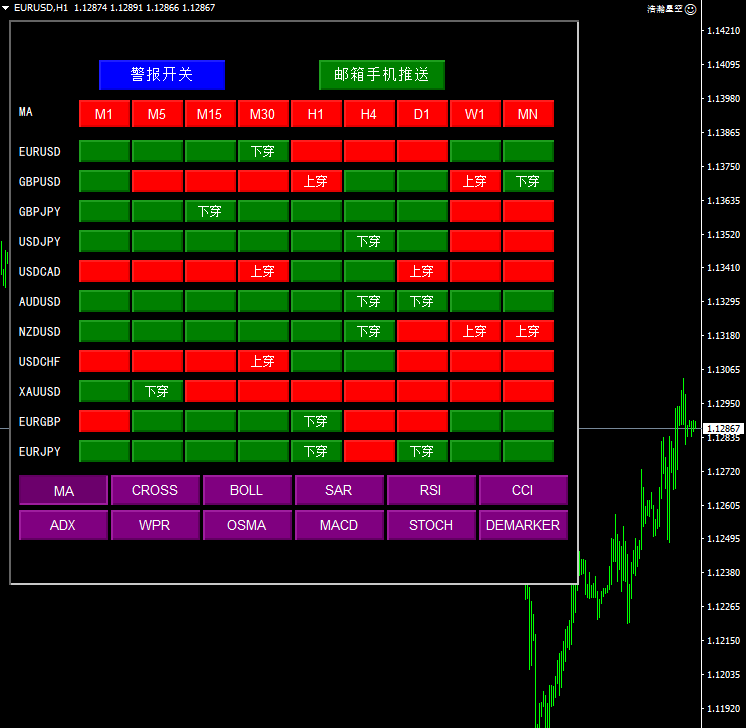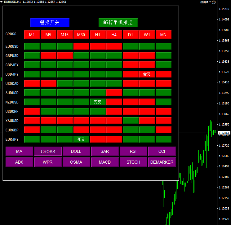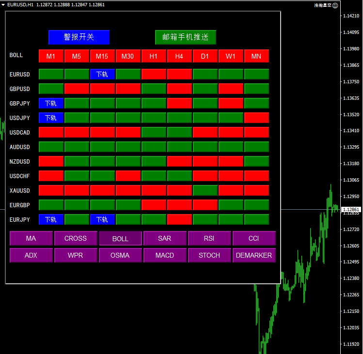 指标原理: 12指标 监控多周期 多品种 满足警报 邮箱推送 均线 均线交叉 布林上下轨穿越 SAR RSI CCI ADX WPR OSMA MACD STOCH DEMARKER 参数 监控周期 可以设置 点方块自动切换图表 MA K线上穿均线 红色方块 K线下穿均线 绿色方块 CROSS 双均线金叉 红色方块 双均线死叉 绿色方块 BOLL K线上穿中轨 红色方块 上穿上轨蓝色 K线下穿中轨 绿色方块 下穿下轨蓝色 SAR K线上穿SAR 红色方块 K线下穿SAR 绿色方块 RSI RSI上穿水平位 绿色方块 RSI下穿水平位 红色方块 CCI CCI上穿水平位 绿色方块 CCI下穿水平位 红色方块 ADX ADX双线金叉 红色方块 ADX双线死叉 绿色方块 WPR WPR上穿水平位 绿色方块 WPR下穿水平位 红色方块 OSMA MACD双线金叉 红色方块 MACD双线死叉 绿色方块 MACD MACD快线上穿零 红色方块 MACD快线下穿零 绿色方块 STOCH STOCH双线金叉 红色方块 STOCH双线死叉 绿色方块 DEMARKER DEMARKER上穿水平位 绿色方块 DEMARKER下穿水平位 红色方块