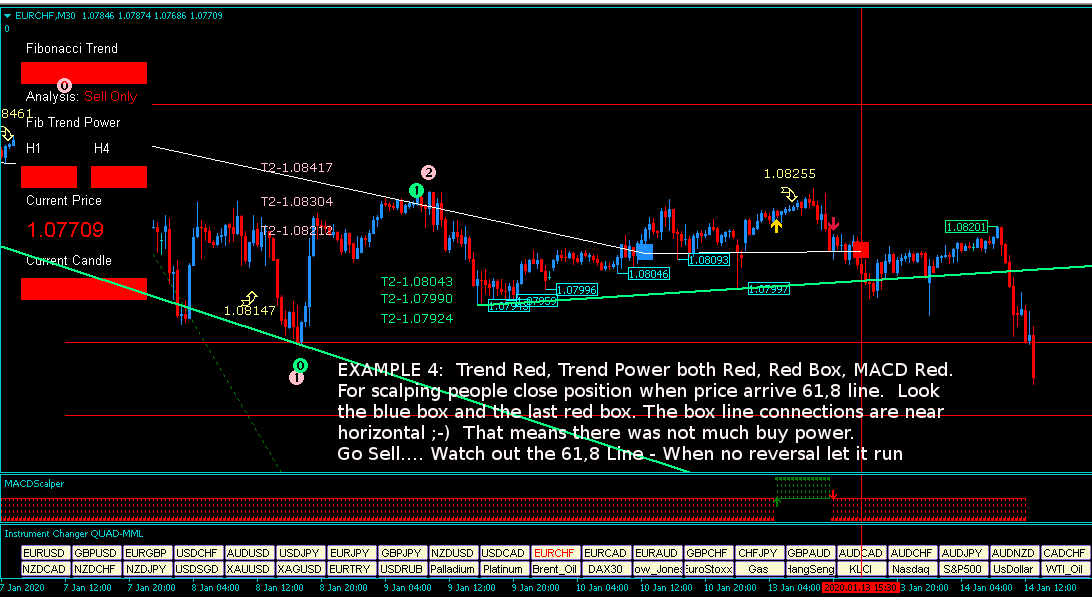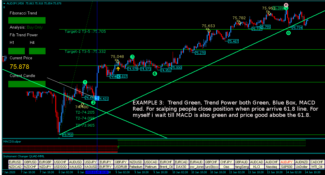 1、主图的左侧中, Fibo Trend 显示为绿色;Trend power都显示为绿色。