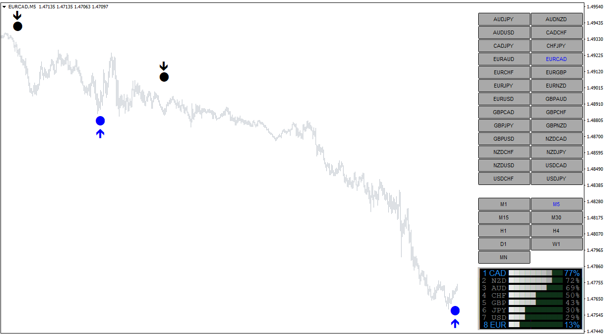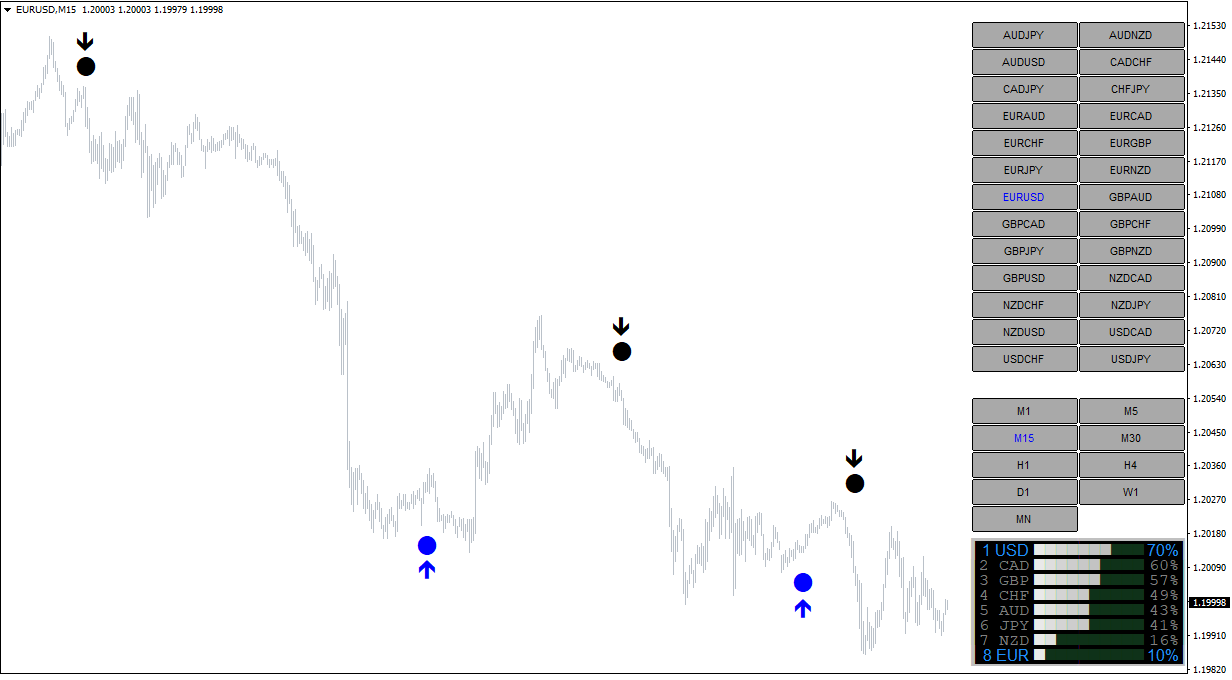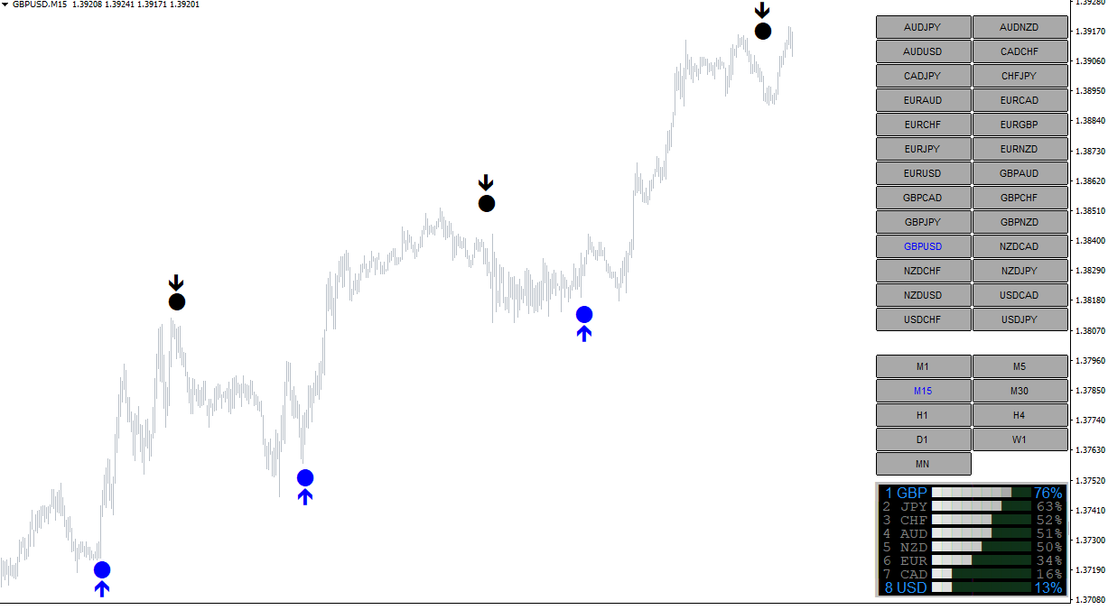 先看货币强弱图表,比如GBP很强势,而USD很弱,那么就可以做多GBPUSD,等待图表中出现做多的蓝色圆点,就可以开多单了。