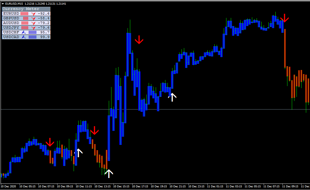 指标由几个部分组成,一个是主图蜡烛图显示成蓝色和红色,一个是左上角显示货币对趋势,一个是在主图显示进场和出场时机箭头。
