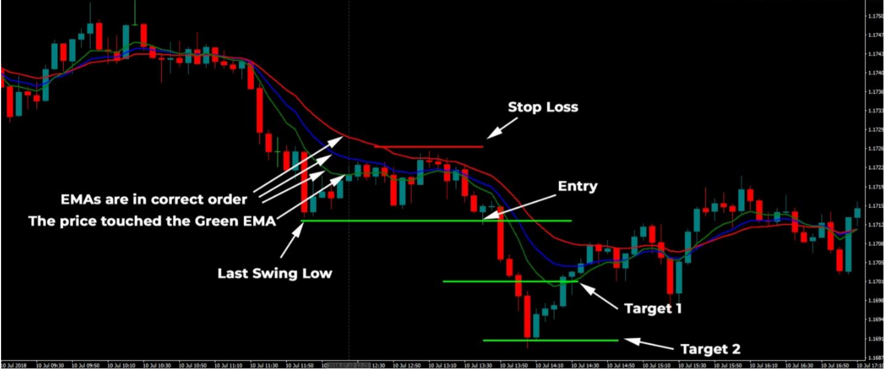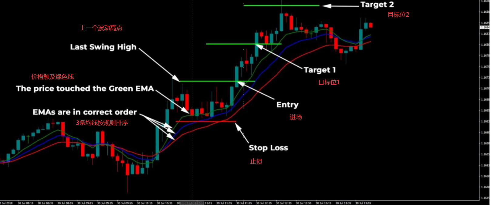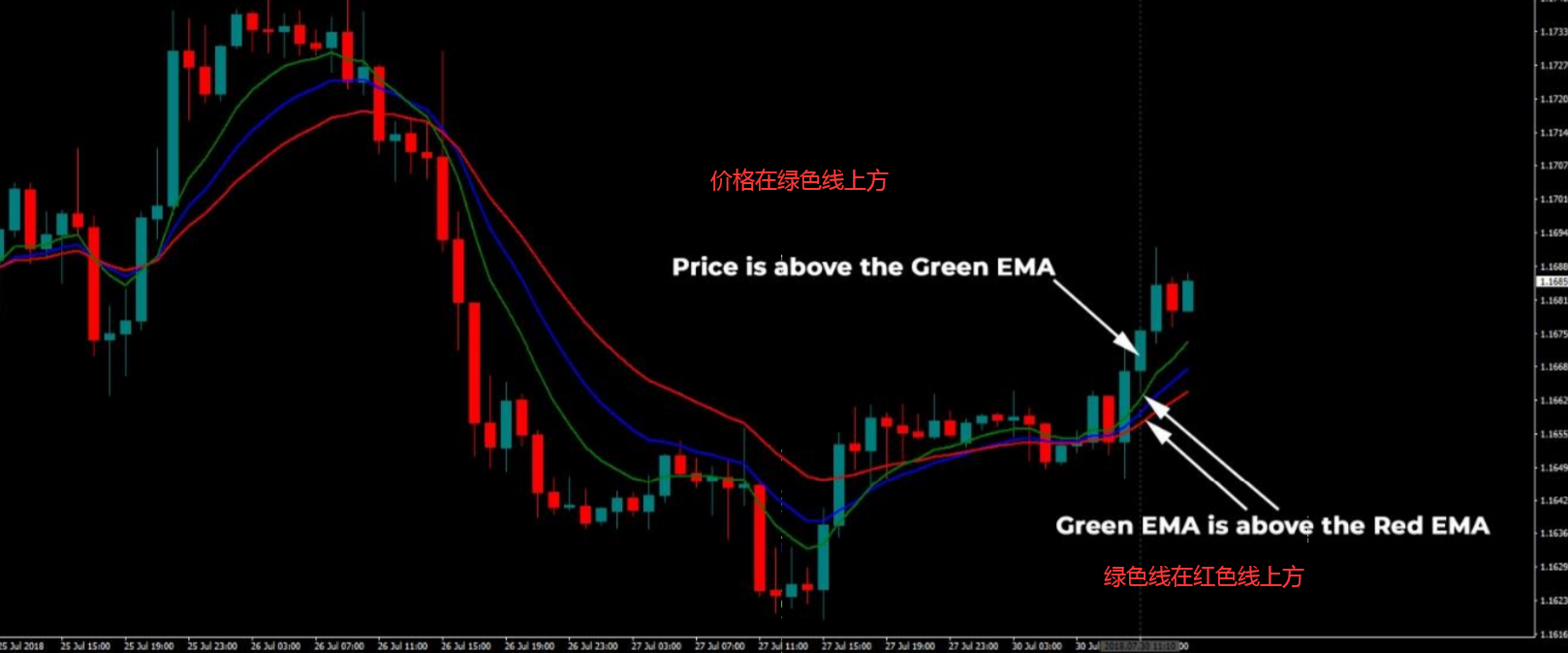 4、价格出现回调:价格需要触及绿色线,K线需要收于红色线上方(如果没有,就不要交易)