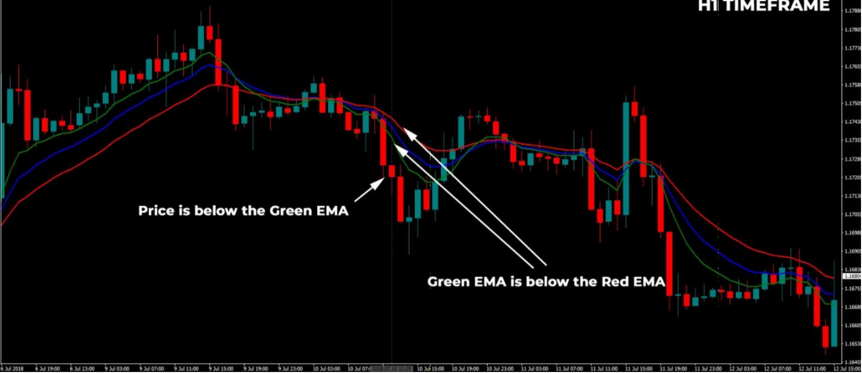 1、在H1时间周期上,绿色线在红色线上方