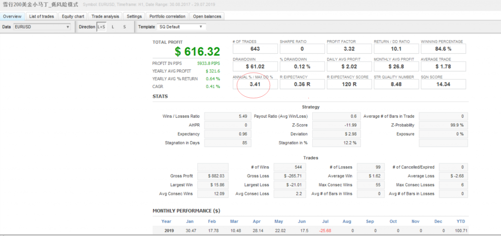 关于雪行200美金小马丁参数说明: 此EA有两种模式,盈利模式和低风险模式。 盈利模式长期盈利强于低风险模式,强损的概率也大。比如下图盈利2488.72,强损3次。 |