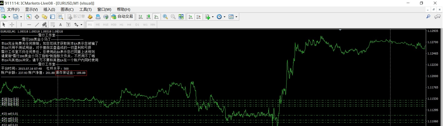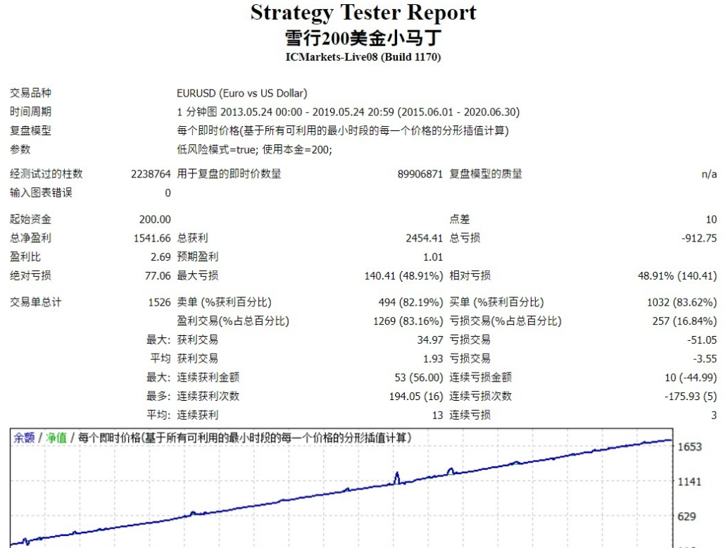 适用货币:EURUSD 适用周期:M1-H1 以下是原作者在其他平台说的,我只是一字不落的copy过来。 这个EA确实一般,盈利也不强,但是tick数据回测是能看出来一些问题的,IC平台的点差比较低,回测用的是10,是清楚的告诉你爆仓了几次,什么时候爆仓的,回测有一定参考价值的,是不限制回测、不限制实盘、不限制平台、不限制时间、不用开户、不用加qq微信,下了就能用,能一直用的EA,希望论坛有更多的这样的EA出现。 当然最重要的免责声明必须要有:回测只能反映此EA从15年6月1号到现在总体是不亏的。马丁有无比巨大的风险,未来的行情谁也不能预料,保证金市场最大的确定就是不确定。你拿去实盘亏钱了不要跑来怪我。建议自己多多测试,因为现实过夜费都是变的,所以测试数据按的是保守的来的,过夜费全部按负的来算了,实盘还要更好出场一点。模拟盘再试试,对风险有充分的认识之后再考虑实盘。