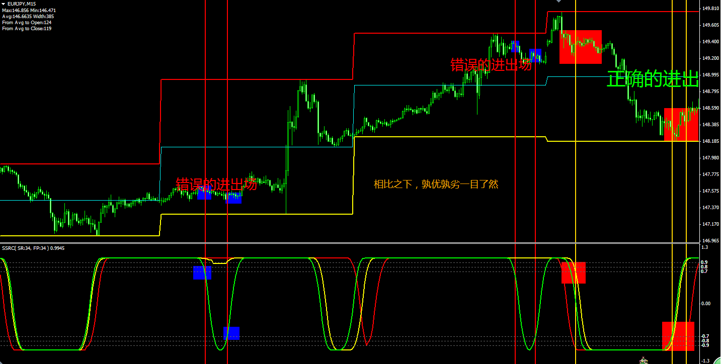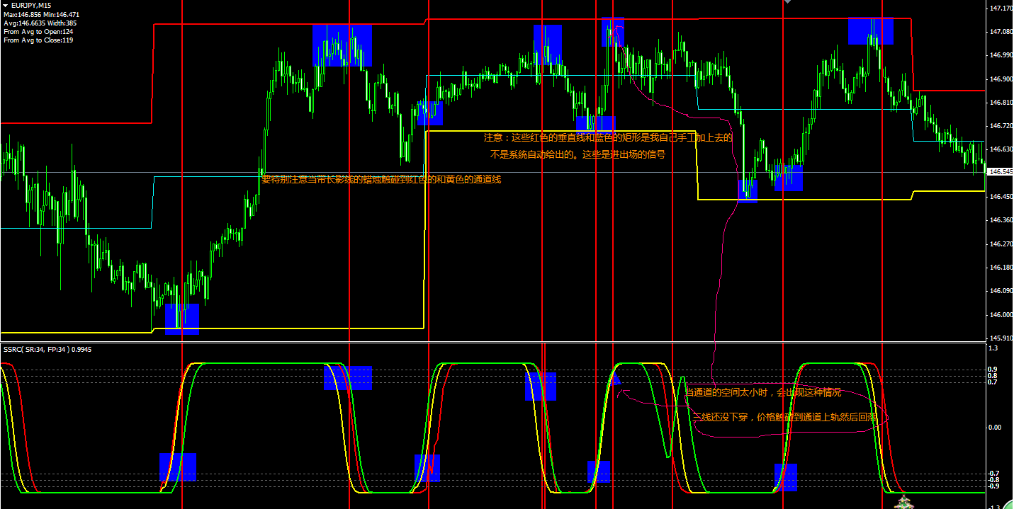 出场:当附图中的SSRC_Force指标中的三线相继下穿0.7水平线的同时,在主图中的蜡烛(特别是带长影线的)触碰到红色的通道线后回落时平仓。