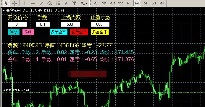 MT4快速下单/平仓/仓位管理EA,自己用的小工具EA,只适用于MT4 600以上版本,主要功能有快速下单,包括BUY SELL BUYLIMIT SELLLIMIT BUYSTOP SELLSTOP,如图所示,如果开仓价格填0,那么就是直接入场的BUY或者SELL单子,如果填上指定的价格,再点BUY或者SELL,就会根据价格自动判断是下LIMIT还是STOP单子。 可以自定义手数,止盈止损点数,如果止盈止损填0的话,就是下单不带止盈止损。 后面三个按钮多单全平,空单全平,多空全平,就不用解释了,这个平仓也包含对应的挂单的。 可以统计你附加EA商品的多空单个数、手数、盈亏,以及均价等信息 |
