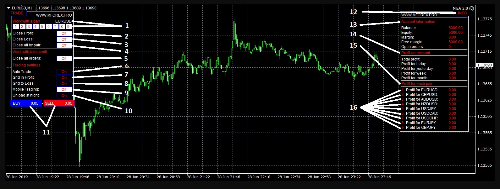 1.EA工作的选择。您可以在下面的INFO面板中看到,每对(16)都有数字,要选择所需的一对,只需按下带有数字的按钮,然后开始工作。选项包括:打开订单(11),关闭所选对的所有订单(4),仅关闭正区域内的订单(2),仅闭合亏损订单(3)。默认情况下,不选择该对;与安装顾问的那对搭档合作。