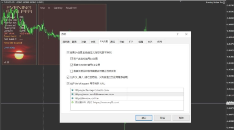 注意事项:关于EA版本本次分享的 Evening Scalper Pro EA是168版MQL5官网上在2022年4月23日的时候已更新到了1.69版关于MT4版本和DLL文件:该EA对MT4版本有要求同时包含msmg32d安装方法查看文子底部关于set文件附件中包含2个设置文件,均为官方提供关于图表加载:只加载到一张图表即可建议加载到EURUSD M5图表【其他交易品种也没毛病的是TCK频率要及时】关于新闻过滤GMT自动识别:EA运行之前要把3个网站加载到"工具"-"选项”-"EA交易"-“允许Webrequest用于所列∪RL"中【需调用链接已通过文本形式保存在附件中】