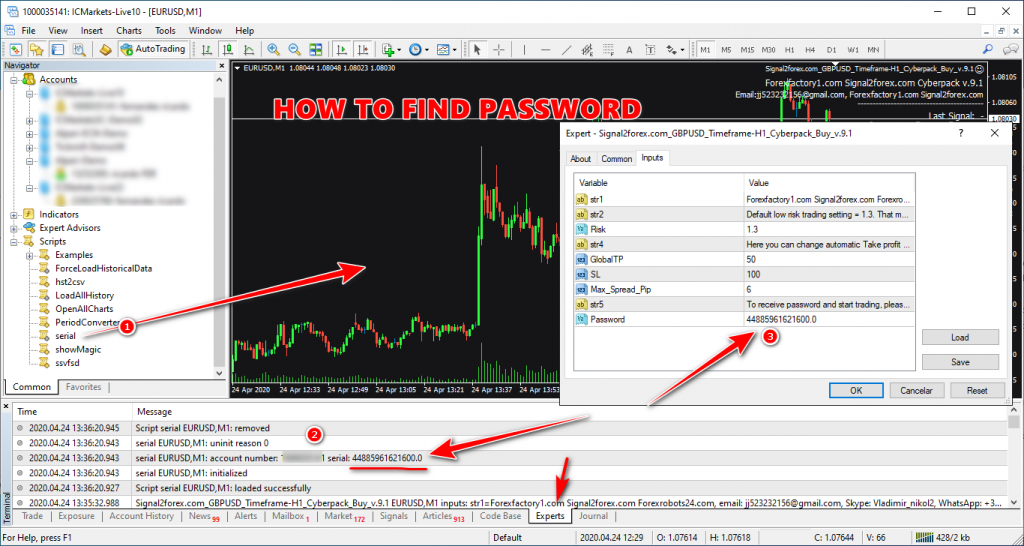 先运行压缩包里的脚本文件,获取ea的密码,密码会显示在客户端EA日志里。然后把每个货币对都打开2个图表,分别用来加载buy和sell EA.。。。。。。